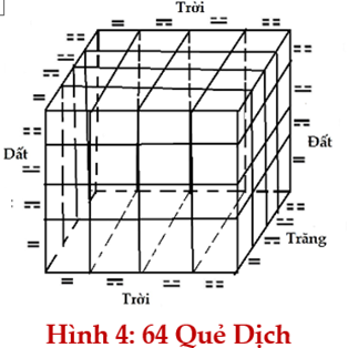 Phương pháp dùng vạch đứt và vạch liền để diễn tả 4 trường hợp là phương pháp Kinh Dịch đã dùng: Hào 1 và 2 thuộc Trăng, 3 và 4 thuộc Đất, và 5-6 thuộc Trời. Trong Hình 3, ba thanh ngang tượng trưng, theo thứ tự, Trời, Đất, Trăng, còn 4 đuôi bên dưới tượng trưng Thái âm, Thiếu âm, Thiếu dương, và Thái dương. Đồ hình Kinh Dịch, Hình 3, cho ta công thức 64 bằng 4 lũy thừa 3 (Hình 4). Trong công thức đó, 4 là Tứ tượng, ba lần 4 là ba thanh ngang tượng trưng Trời, Đất, Trăng.
