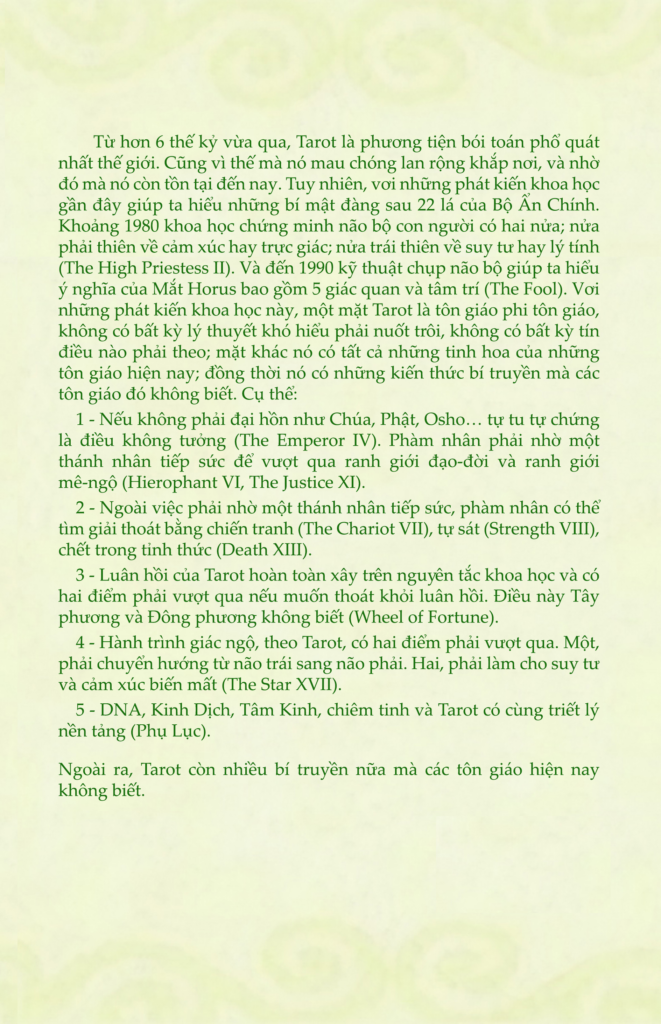 Nhưng bằng cách nào làm cho suy tư và cảm xúc biến mất mà nhận ra bản tính chân thật của mình? Bí mật là biến hai não thành một, để não trái không bị suy tư bó buộc, và não phải không bị cảm xúc kiềm chế. Đó là tóm tắt toàn thể những kiến thức bí truyền lần đầu tiên được tiết lộ trong Tarot Vạn Xuân. Những kiến thức bí truyền này các tôn giáo hiện nay hoàn toàn không biết.
